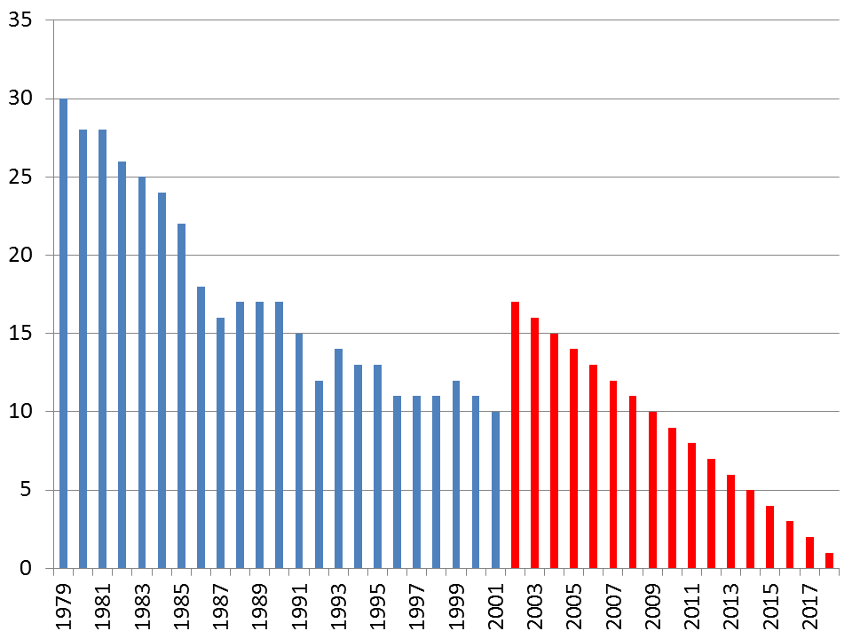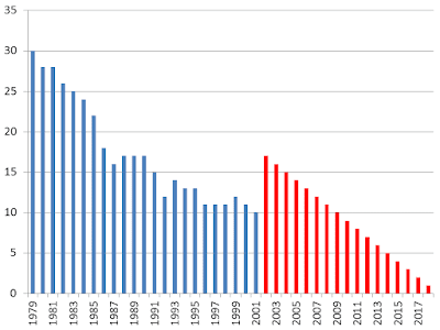 Tässä on huomattava, että mainitun muutoksen jälkeisten eli punaisten pylväiden tasainen pieneneminen ei enää johdu tilastollisen merkitsevyyden saavuttamisajan lyhenemisen vaan yksinkertaisesti niiden kuvaaman aikasarjan lyhenemisen takia. Ensi vuonna ne muuttunevat jälleen yhtä pykälää (eli vuotta) korkeammiksi, ellei sitten käy niin, että napajään pinta-ala alkaa jälleen supistua eli arktisen alueen ilmasto lämmetä.