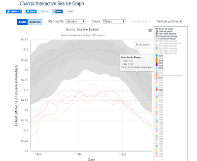 Lopuksi vielä pieni katsaus pohjoisen merijään tämän hetken tilanteeseen. Juuri nyt se on nimittäin peräti mielenkiintoisessa tilanteessa, koska jään laajuus ylittää lähes päivittäin niitä kokoja, joita se on saavuttanut suurimmillaan aikaisempina vuosina.