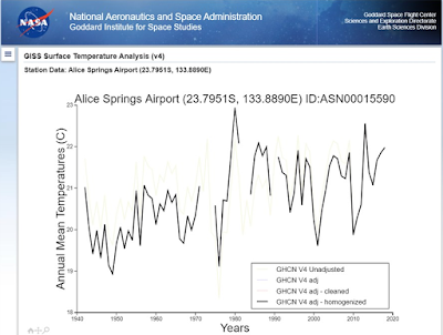 Itselleni asialla ei ole enää merkitystä, sillä olen ajat sitten lakannut pitämästä GISS:in julkaisemia ilmastotilastoja edes viitteellisesti luotettavina. On kuitenkin mielenkiintoista, että Alice Springsin ilmastotilastojen muutos ei ole ollut pelkästään yksisuuntainen, vaikka kehitys jossain vaiheessa näyttikin siltä, kuten esimerkiksi tästä vuodelta 2016 peräisin olevasta tallennuksestani voisi päätellä.