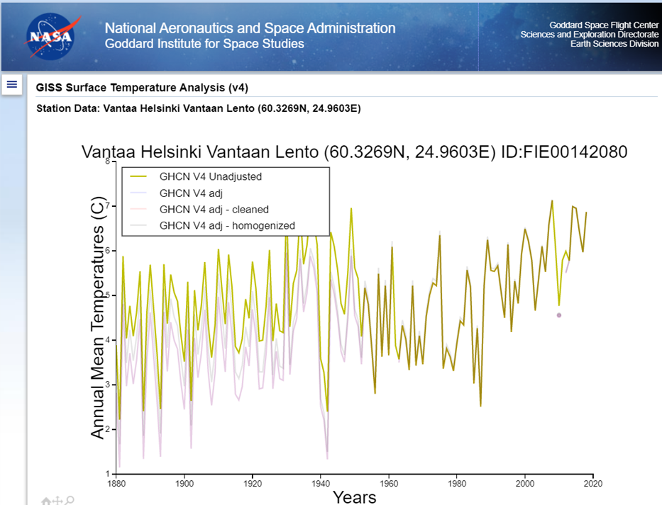 Koska nyt näyttää kiistattomalta, että Keski-Australian ilmasto elää omaa elämäänsä päätin katsoa, mitä tapahtuu meille tutumman paikan eli Helsinki-Vantaan ilmastohistorialle GISS:in käsissä. Turvauduin asiassa pelkästään GISS:in omiin tilastoihin eli seuraavassa kuvassa on heidän ilmoittamansa alkuperäisdata.