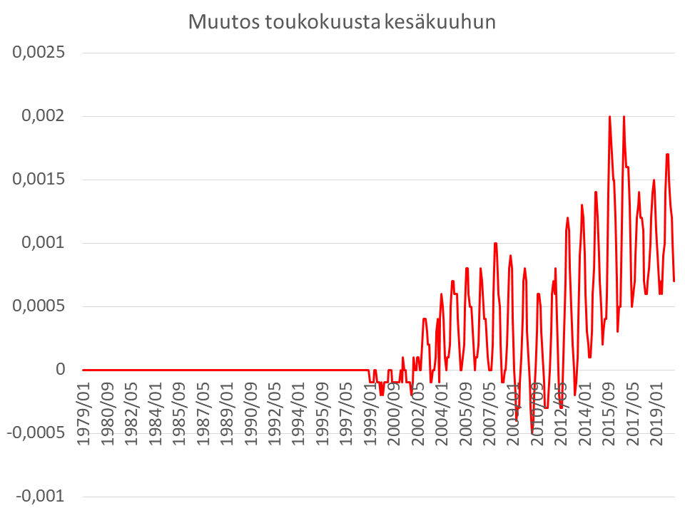 Lisäksi pyydän arvoisia lukijoitani kiinnittämään huomionsa muutoksen suuruuteen: se on niin pieni, ettei satunnainen tarkastelija huomaa mitään erikoista. Muutoksen voi siten havaita vain, mikäli estimaatit on otettu talteen vertailua varten tai vertailu tapahtuu hyvin pitkällä aikavälillä.
