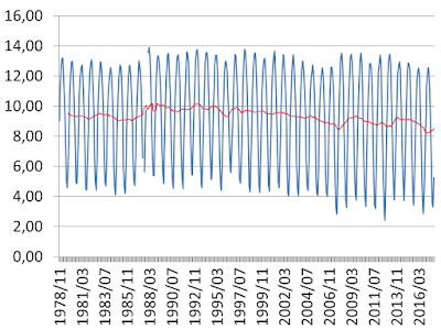 Arvoisan lukijani on syytä huomata, että yllä olevan kuvan sininen käyrä on epäjatkuva, mikä tarkoittaa, että käytettävissä olevasta datasta puuttuu muutama mittausarvo. Nämä datan puutteet ajoittuvat vuosille 1987 ja 1988.