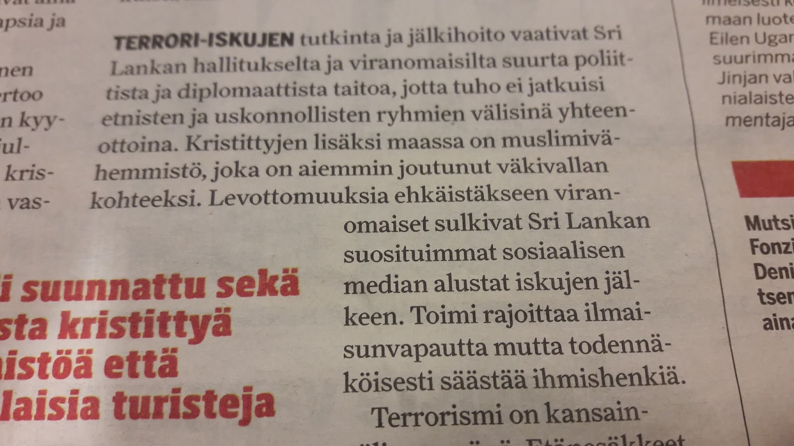 Ilta-Sanomat puolestaan kirjoittaa anonyymissa pääkirjoituksessaan, että ”[l]evottomuuksia ehkäistäkseen viranomaiset sulkivat Sri Lankan suosituimmat sosiaalisen median alustat iskujen jälkeen. Toimi rajoittaa ilmaisunvapautta mutta todennäköisesti säästää ihmishenkiä.